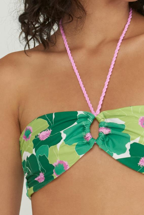 La parte superior presenta una correa retorcida y atada única con puntas de campana.